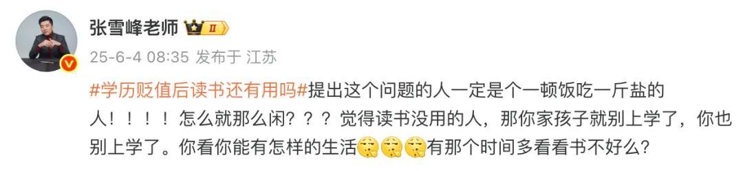 一边是粉丝的狂热追捧,一边是同行专家的口诛笔伐,始终在争议中前行的张雪峰,在今夏高考季前夕突然宣布停播。4日,刚刚宣布停播的张雪峰,又因在微博怒斥“学历贬值无用论”而再提热搜。他在该话题下回复,“提这个问题的人怎么那么闲!”此前张雪峰还曾在直播间直言,不读书连被淘汰的资格都没有。
